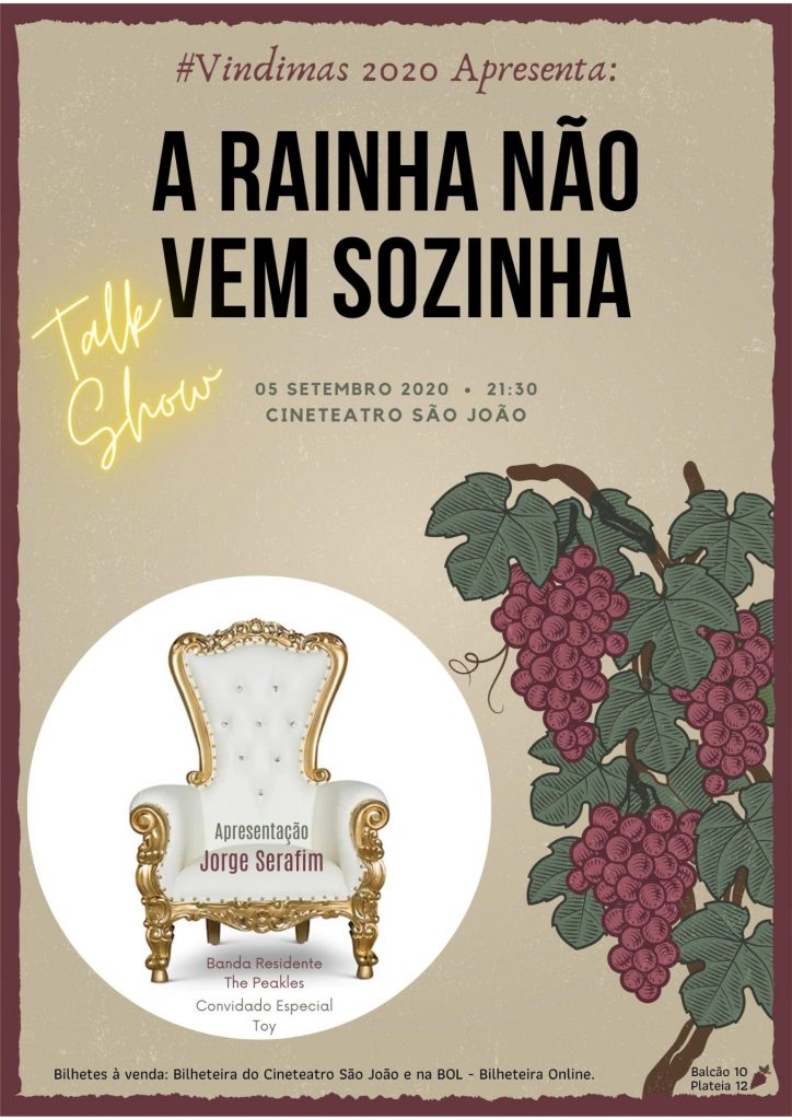 A Rainha não vem sozinha/ FunParra/ New Music Collective/ Drive-in Miguel Azevedo/ Novo Tango Velho A programação Vindimas 2020 compõe-se de espetáculos organizados em diversos locais (Cineteatro São João; anfiteatro do Parque Venâncio Ribeiro da Costa; parque de estacionamento detrás de São Pedro e nas ruas de Palmela). Para mais informações, consulte a nossa programação […]